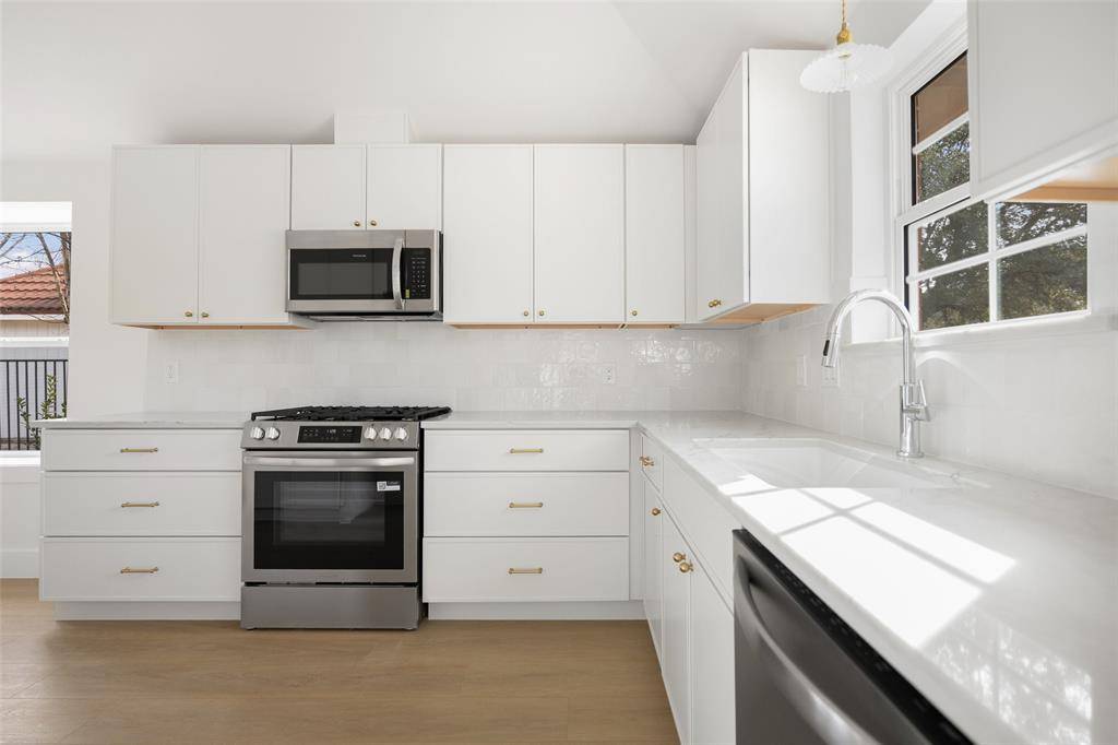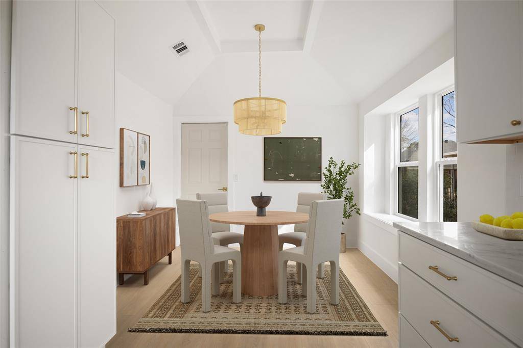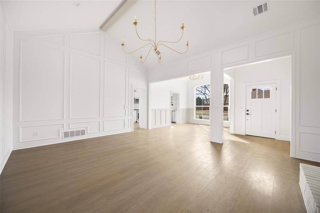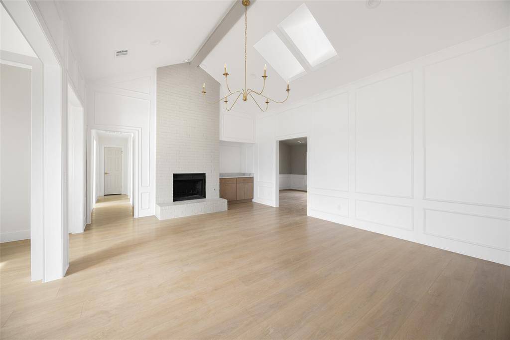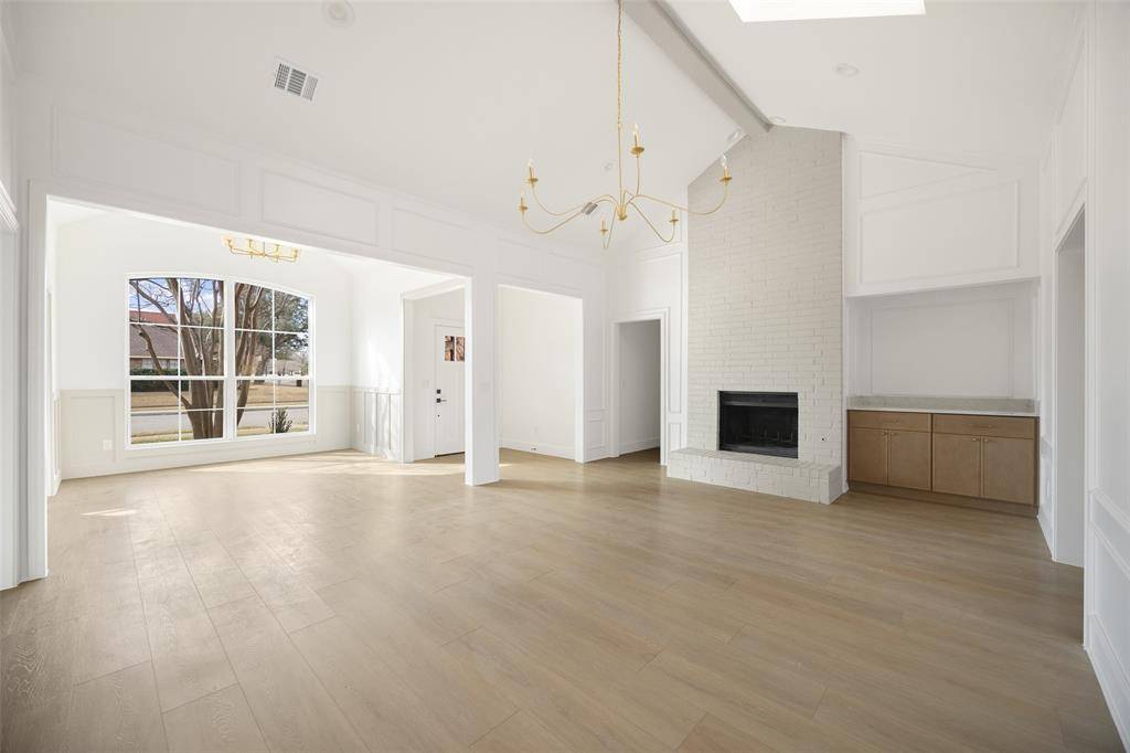 Welcome to this beautifully renovated single-story 4-bedroom, 2-bath home, thoughtfully reimagined by Maverick Design in the heart of Plano. Blending timeless character with modern sophistication, this home offers a seamless balance of style and comfort. Featuring vaulted ceilings, abundant natural light, and wide-plank flooring throughout the open-concept living space showcases elegant wall paneling, a statement chandelier, skylights, and a striking brick fireplace, flowing seamlessly into a fully remodeled kitchen with custom white cabinetry, quartz countertops, stainless steel appliances, gas range, and designer finishes. Each bathroom has been beautifully updated with curated details, and the serene primary suite boasts a spa-like ensuite complete with a soaking tub. Enjoy a private backyard with fresh fencing, lush grass, and a covered patio perfect for relaxing or entertaining. Ideally located near shopping, dining, and major roadways, this beautiful home combines timeless charm with modern style in a prime Plano neighborhood.