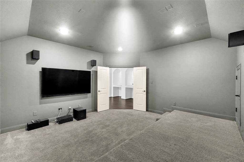 A fully equipped media room with television and surround sound creates the perfect space for movie nights or hosting gatherings. The three-car garage provides ample storage and convenience.