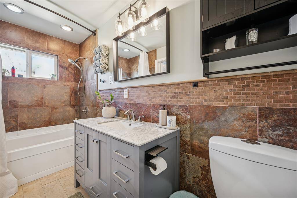 The primary bedroom offers generous proportions along with an updated en-suite bath featuring a marble-look vanity, modern lighting, and custom tile shower surround. Two additional bedrooms are well-sized with convenient access to a secondary bath, providing flexibility for guests, office space, or additional living needs. A dedicated laundry area and abundant closet storage enhance everyday functionality.